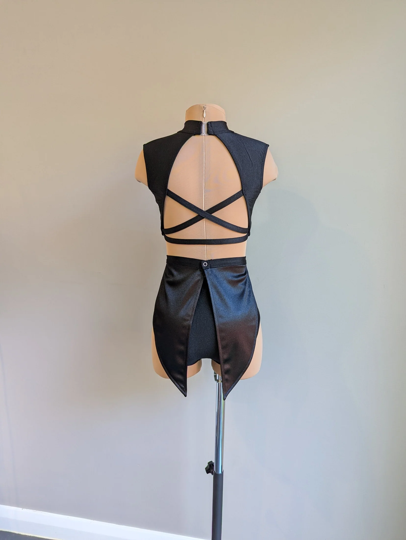The Rory tuxedo leotard showcases stylish waist cutouts, a front mesh V with imitation white collar lapels, and a detachable waist belt with attached tails. Fully lined for comfort and style, it provides a flattering fit for dancers of all ages.